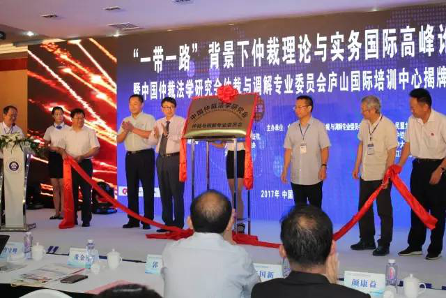 2017年7月14日,由中国仲裁法学研究会仲裁与调解专业委员会、九江仲裁委员会和民盟九江市委会主办的“一带一路背景下的仲裁理论与实务高峰论坛”在江西省九江市隆重举行,论坛期间举行了中国仲裁法学研究会仲裁与调解专业委员会揭牌仪式。最高人民法院、民盟中央法制委员会、中国仲裁法学研究会,以及民盟江西省委会、江西省政府法制办、江西省司法厅、九江市委市政府等有关单位领导出席了揭牌仪式。来自马来西亚、香港、澳门的专家学者以及国内多家仲裁机构的领导与仲裁员、企业家、律师、商会、行业协会的代表230余人参加了本次活动。